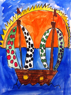 The second grade has continued to work with watercolor paints. We were inspired by a lesson on the art blog Deep Space Sparkle, one of my favorite sources for ideas! For these pictures they sketched out a ship and background. I drew one as they drew and they were allowed to add in any details I had on mine to theirs'. Much fun was had designing their ships. Then they sharpied over their lines and painted it in with water colors. They came out great.
